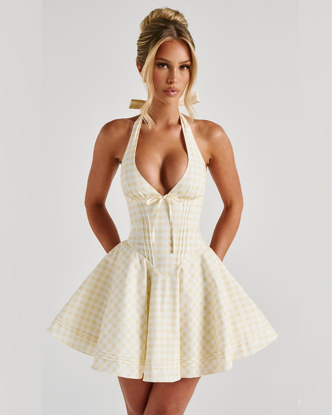 The Matilda Playful Corset Dress is a celebration of sunny days and spirited style. Crafted in a lively lemon gingham print, this mini dress blends soft structure with a lighthearted twist. Featuring a flattering plunge neckline, halter straps, and a delicate tie detail under the bust, it’s designed to sculpt and flatter while adding a dose of carefree energy. Perfect for garden parties, brunches, or any moment made for twirling under the sun.