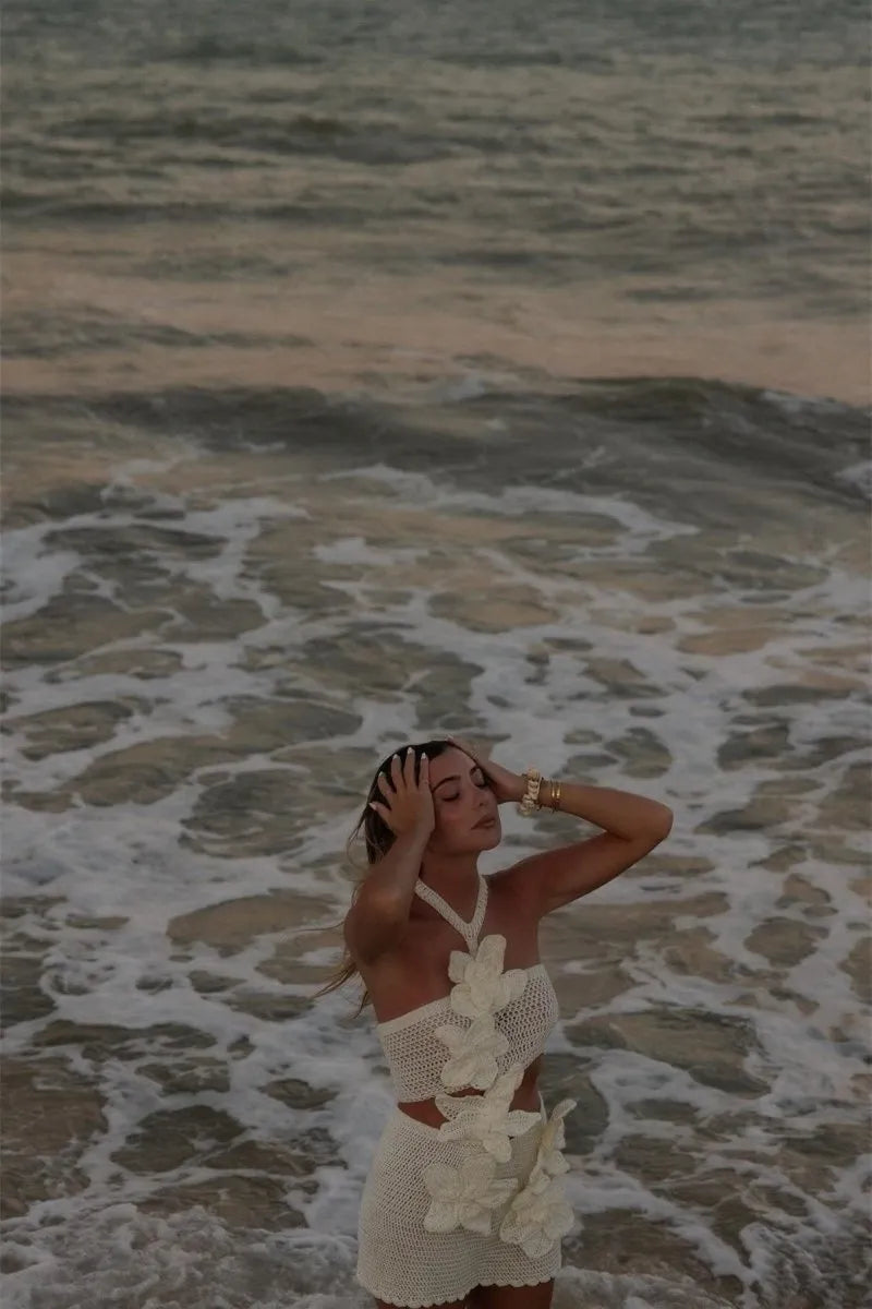 The Ondine Shorebloom Crochet Dress brings sun-drenched charm and artisan texture together in a mini silhouette made for warm escapes. With its intricate open-knit floral weave and halter neckline, this piece offers a refreshing mix of coastal ease and refined structure—ideal for beach brunches, garden gatherings, or sunset strolls.